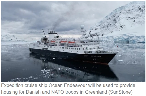 デンマーク、グリーンランドでの演習用にクルーズ船をチャーター 元探検クルーズ船「オーシャン・エンデバー」は、1月31日にグリーンランドの首都ヌークに到着、デンマークおよびNATO軍の演習「アークティック・エンデュランス(北極圏耐久)」期間中の宿泊施設となり、地域...