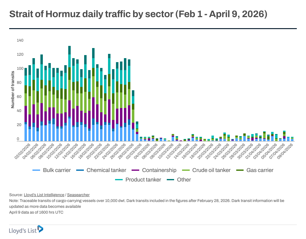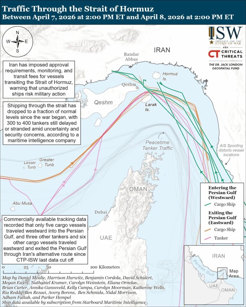 革命防衛隊海軍が指定ルートをイラン側水域に設定、イラン港湾・海事機構は4月8日に「指定ルート」を公開。ルート外は「機雷の危険」と警告、分離通行帯が通れない。米政府関係者は「少なくとも12個のイラン機雷が存在」と指摘。 最高指導者モジャタバ・ハメネイは4月9日、ホルムズ海峡の管理を「新たな段階に引き上げる」と発言したが、戦争終結後も海峡を戦略的レバレッジとして使い続ける意図だろう。 4月8日〜9日の24時間で 3隻の貨物船と1隻のタンカーが入域、6隻の貨物船と4隻のタンカーが出域。イラン高官は、停戦期間中、1日15隻以上の通航を認めないとロシア国営メディアに発言。