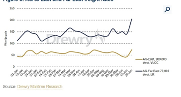 ・通過を待っているVLCCとLNGは動けず、保険会社は戦争リスク・プレミアムを発動し、海運料金は急上昇、数隻の船がペルシャ湾に閉じ込められ、供給不足をさらに悪化させる可能性