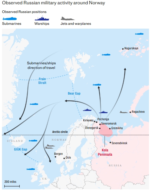 最近の拡張以前から、北方艦隊は少なくとも16隻の原子力潜水艦と音速の8倍で飛行できるツィルコンと呼ばれる極超音速ミサイルを保有しており、米英とノルウェーはこれらの活動を絶え間なく監視しており、これはNATOで最も重要な監視任務といえる。