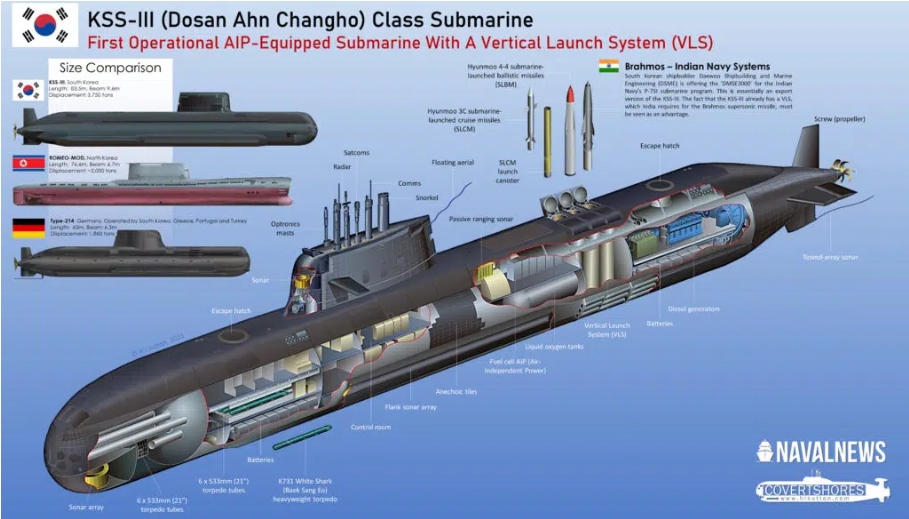 最新のKSS-IIIは、初めての純国産設計であり、現在、3隻のバッチ1 KSS-III 潜水艦が運用されており、最初のバッチ 2潜水艦は 1 週間前に進水した。KSS-IIIは、改良された推進装置、より優れたソナー、新しい魚雷、およびバッチ1と2がそれぞれ6基と10基のK-VLSセルを搭載し、従来の韓国の潜水艦より大幅に能力を向上させている。これらの改善により、排水量はバッチ 1で水中3,750トンになり、バッチ 2ではさらに増加すると予想されている。