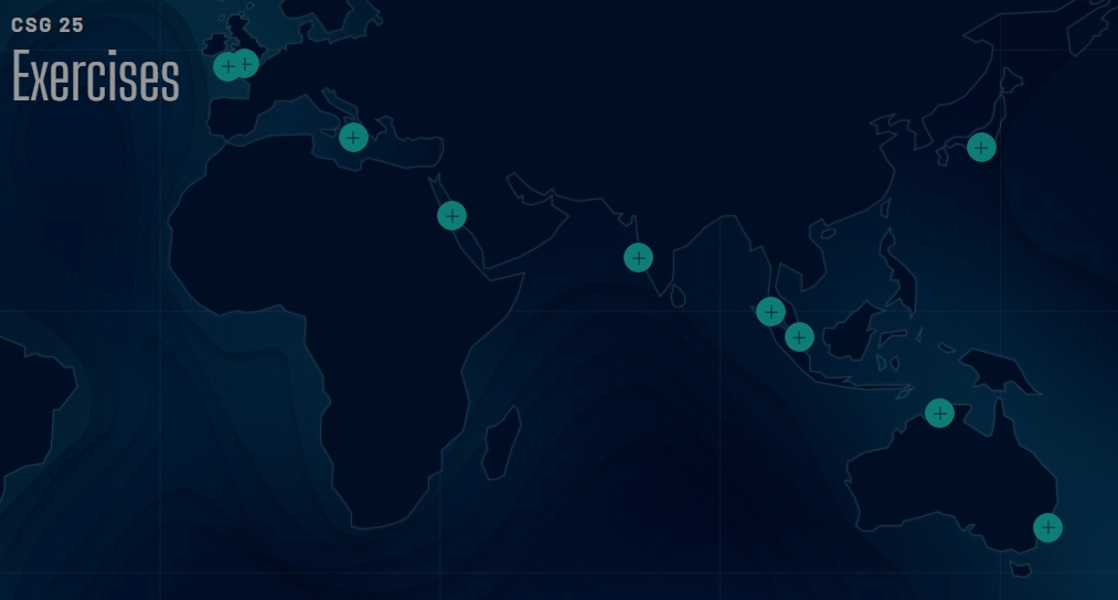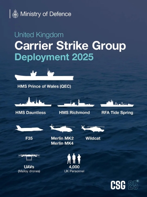 現在、CSGには空母「プリンスオブウェールズ(Prince of Wales、R09)」、駆逐艦「ドーントレス(Dauntless、D33)」、フリゲート「リッチモンド(Richmond、F239)」、ノルウェー海軍フリゲート「ロアルド・アムンセン(Roald Amundsen、F311)」が含まれている。